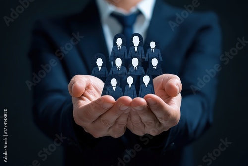 Supporting the Team: A business leader cradles a team of miniature figures in his hands, representing unity and teamwork within a corporate structure.