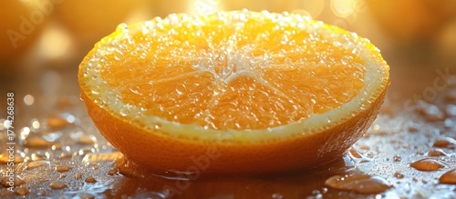 Juicy orange half with water droplets on a surface.
