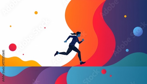 An athlete in mid stride running against a dynamic, abstract background with flowing lines and geometric shapes that resemble a fluid space, likely representing motion and progression.