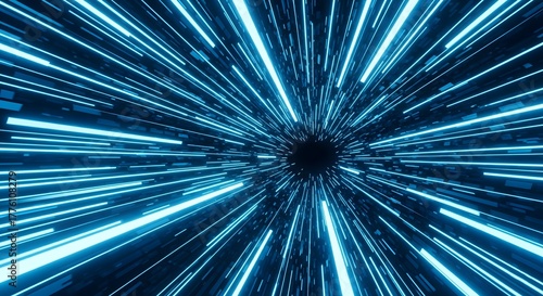 A vibrant blue futuristic hyper-speed light tunnel background illustrating digital data travel, technology communication, and abstract science fiction cosmic warp effects