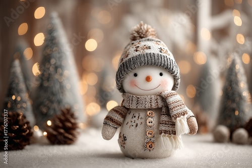 Śliczny, mały bałwanek w dzierganej czapce i szaliku, otoczony zimowym, świątecznym tłem z rozmytymi światełkami. Urocza dekoracja.