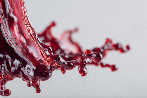 Ekstremalnie dynamiczne ujęcie rozprysku ciemnoczerwonego płynu (wino, sok owocowy) w powietrzu, z wiszącymi kroplami i wyraźnym ruchem, na jasnym tle.