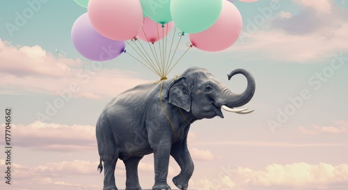 Large mammal floats skyward supported by colorful buoyant spheres tied to its back