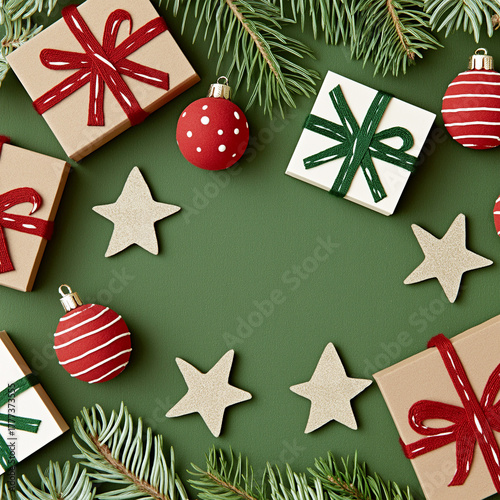 Flat Lay of Christmas Gift Boxes, Red Baubles, and Stars on Green Background, Holiday Decoration