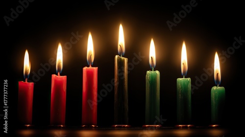 Seven Kwanzaa candles in arc formation with warm glowing flames, three red one black three green, dramatic low-key lighting and cinematic macro look symbolizing African heritage, unity and celebration