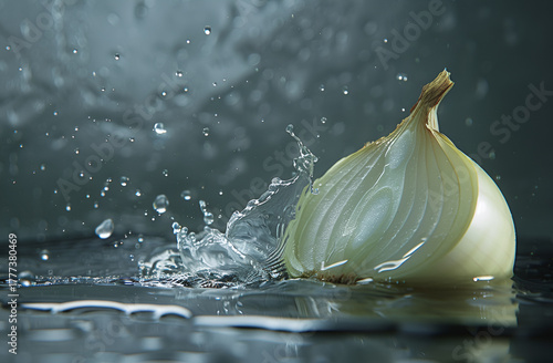 Połówka cebuli wpadająca do wody na ciemnym tle – dynamiczne ujęcie produktu spożywczego z efektem rozprysku