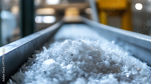A conveyor belt filled with white, translucent plastic flakes. The flakes shimmer under industrial lighting, creating a textured, crystalline effect. Recycling in progress.