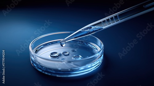 Pipette versant une goutte dans une boîte de Petri sur fond bleu