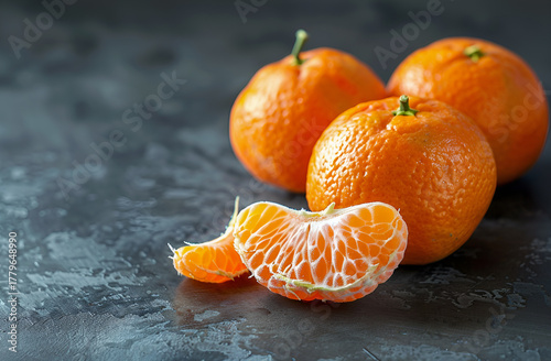 Świeże mandarynki i cząstki owocu na ciemnym tle – soczyste cytrusy pełne witamin