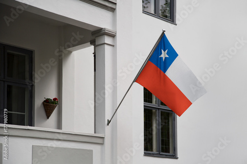 Chile flag. Chilean flag displaying on a pole in front of the house. National flag of Chile waving on a home hanging from a pole on a front door of a building.