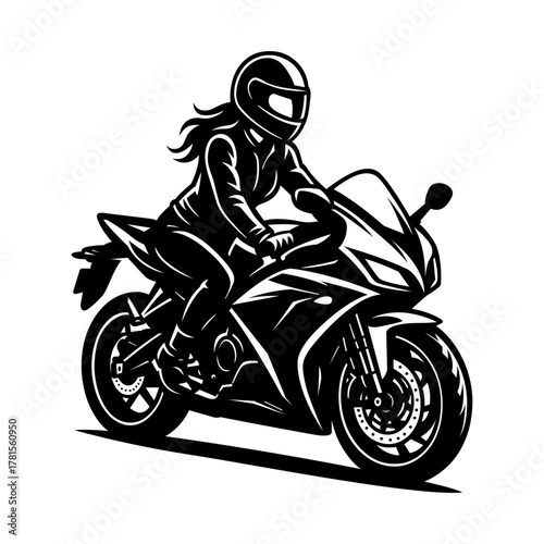 Girl Motorcycle Rider Vector Illustration – Woman on Sport Bike Black and White Biker Girl Design for Logos and Prints