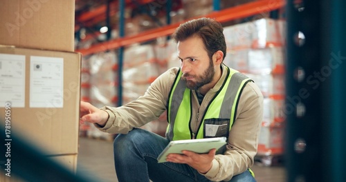 Logistics, tablet or man with inventory in warehouse for box inspection, label accuracy or shipping. Supply chain, picker and cargo database for order picking, backlog update and package distribution