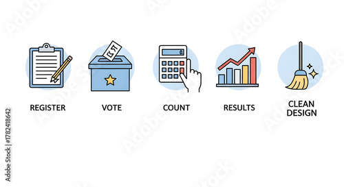Voting Process Icons: A clean, concise graphic illustrates the essential stages of voting. From registration to casting a ballot, counting votes, reporting results, and maintaining cleanliness.