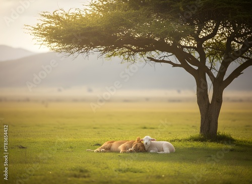 Incredible bond lion and lamb peacefully resting together under a tree in a serene landscape at sunset, nature's unlikely friendship concept