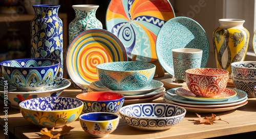 #1381153012Colorful dinnerware set with floral pattern. AI generated