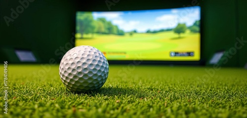 White golf ball with black dot rests on green field, enclosed by green wall Golf simulator in background, golf, simulator