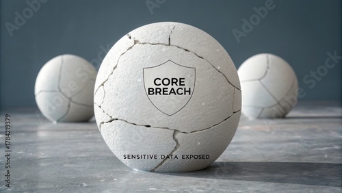 Cracked sphere with core breach and sensitive data exposed warning, illustrating cybersecurity vulnerability and data loss threat