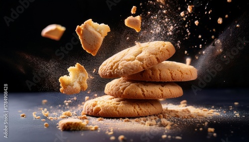 delicious pieces of crumbly shortbread cookies breaking apart in mid air creating a sense of indulgence and delight