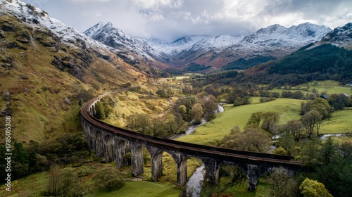 Scenic view of mountainous landscape featuring an iconic viaduct with lush greenery, winding river, and snowy peaks in a serene highland region