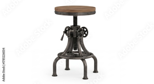 Industrial style adjustable height bar stool with a round wooden seat and a metal crank base, isolated on a white background.
