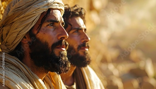Two bearded men with turbans gaze upwards, bathed in sunlight, likely outdoors, with a sense of reverence and contemplation