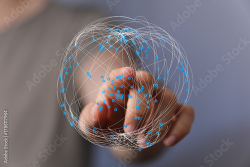 Man's hand touching a digital sphere representing technology, global network, and innovation. Perfect for illustrating communication,