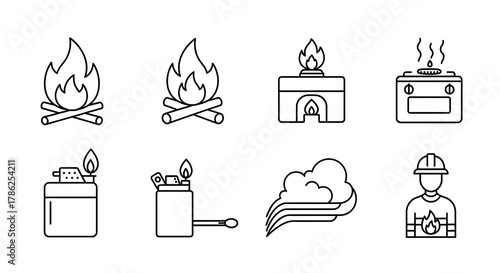 Fire Icons: a diverse collection of fire-related icons, from a cozy bonfire to a firefighter. They are perfect for illustrating fire safety, energy, or any concept connected to fire and heat.