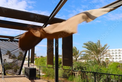 opuszczony hotel na brzegu morza śródziemnego na wietrze powiewa stara zasłona przeciwsłoneczna.