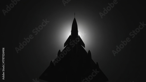 Dark silhouette of military fighter jet on an airforce attack mission at night. powerful weapon shown with dramatic and intimidating backlight