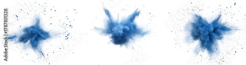 A dynamic display of blue powder explosions captured in a sequence. illustrating motion and energy against a white background. ideal for creative projects or visual effects