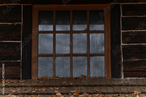 Drewniane okno w starym domu z bali z jesiennymi liśćmi na parapecie
