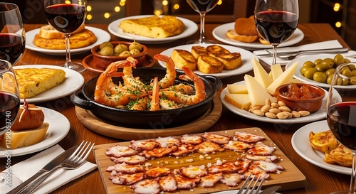 Assortment of Spanish Tapas dishes including prawns cheese olives and octopus with red wine