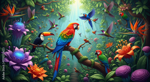 Colorful Parrot and Tropical Birds in 3D Garden Wallpaper, 3D Relief Mural, 3D Wallpapers, 3d Floral art, 3D Wall Mural, 3D Floral Background.