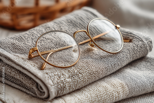 Okulary ze złotą, okrągłą oprawką, leżące na złożonych, szarych i beżowych tekstylnych serwetkach/ręcznikach. Estetyka i detal.