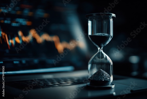 An hourglass sits on a laptop keyboard, with a blurred stock chart in the background, symbolizing the passage of time and financial markets