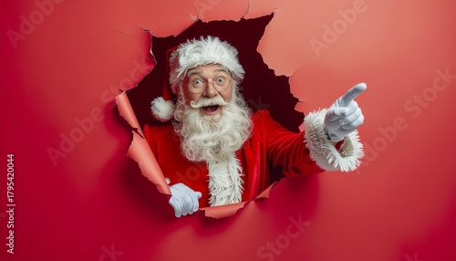 Święty Mikołaj wychodzący z dziury w podartym czerwonym papierze i wskazujący palcem do góry
