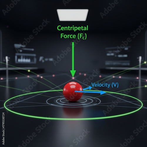 Dynamic physics concept illustrating centripetal force acting on a red sphere in circular motion with velocity vector highlighted
