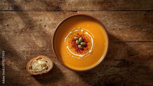 A bowl of orange soup garnished with seeds and spices, served on a rustic wooden table alongside a piece of bread with butter.