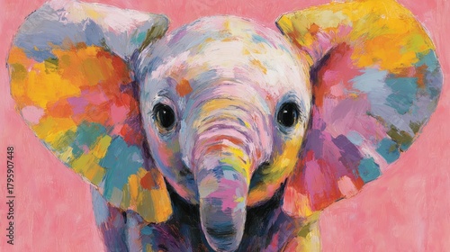 Vibrant, oil painting depicts the face of an adorable young pachyderm