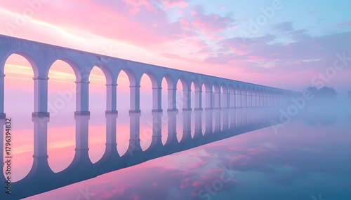 Long viaduct bridge over misty water at sunrise with pastel colors.