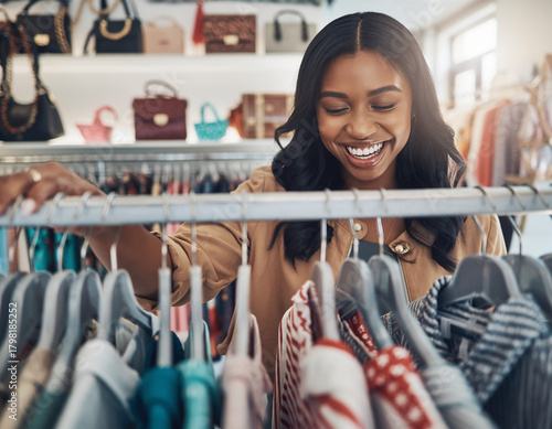Wesoła, uśmiechnięta kobieta robi zakupy w sklepie z odzieżą