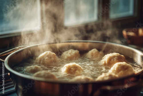 Kluski unoszące się w gotującej wodzie – dynamiczne ujęcie bąbelków, pary i wrzenia podczas tradycyjnego przygotowywania posiłku
