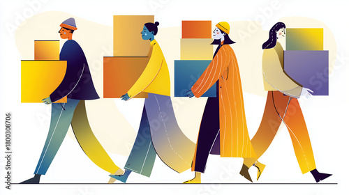 People carrying colorful boxes while walking in an urban setting for Boxing Day