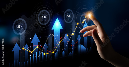 A hand reaches out to a digital graph displaying growth patterns, arrows, and percentage figures, illustrating the theme of progress and success in data analytics. Scalp