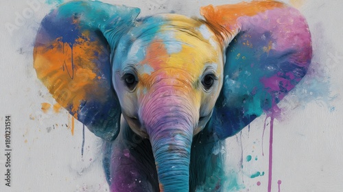 Colorful artistic depiction of a young pachyderm's face rendered with vibrant paint splatters