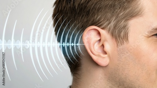 Health effects sound pollution concept. Sound waves emanating towards a human ear, illustrating auditory perception and communication.