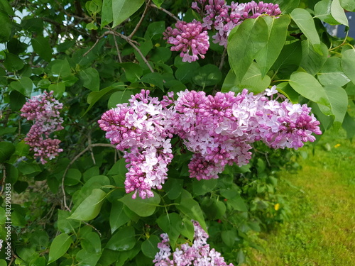Bujny kwiatostan lilaka w odcieniach fioletu z widocznymi zielonymi liśćmi w tle.