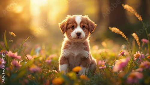 Chiot blanc et brun, joli animal de compagnie assis, portrait d’un petit mammifère à la fourrure douce, isolé dans un décor naturel, expression tendre et attachante.