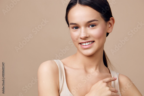 Smiling young woman with long dark hair in a beige top against a light brown background, radiating confidence and warmth
