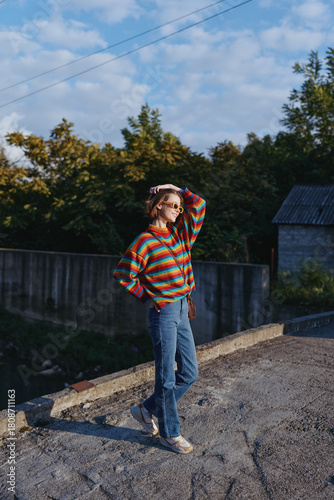 young woman in striped sweater and denim jeans wearing sunglasses, casual outfit, standing outdoors on roadside, early 20s, smiling and shielding eyes, relaxed travel lifestyle fashion vibe